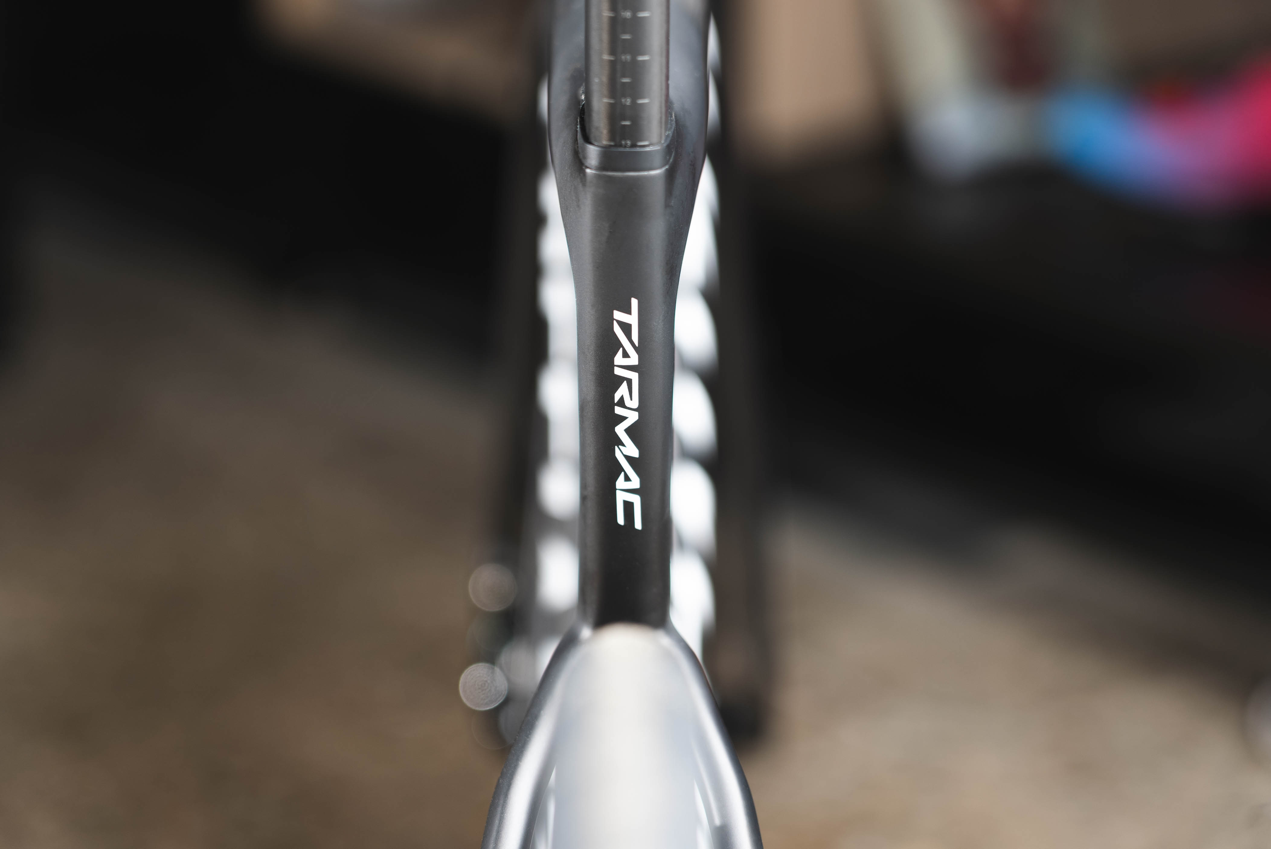 Tot stilstand komen doet deze Tarmac SL8 Pro met de SRAM Force eTap AXS hydraulische schijfremmen. De remgrepen liggen perfect in de hand zodat remmen én schakelen heel vlot verloopt.